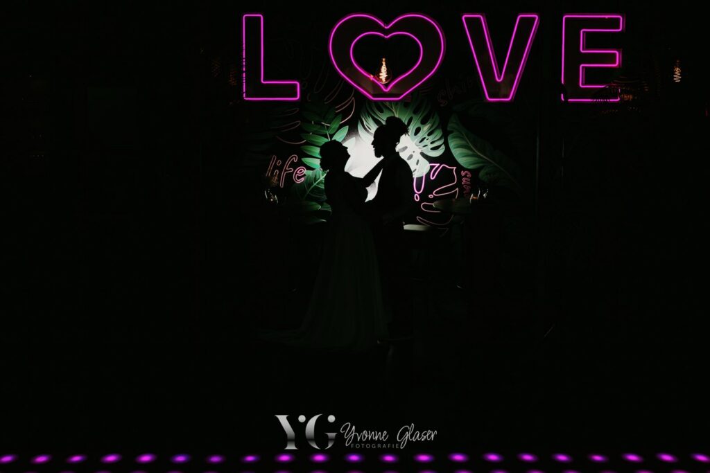 bruidspaar s' nachts bij afscheid door lichtjesboog